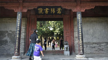 8月7日,游人在嵩阳书院内参观。