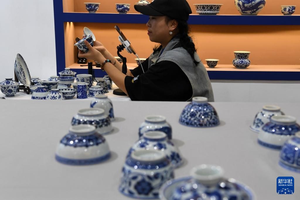 10月18日,一名参展商在瓷博会现场进行网络直播销售。