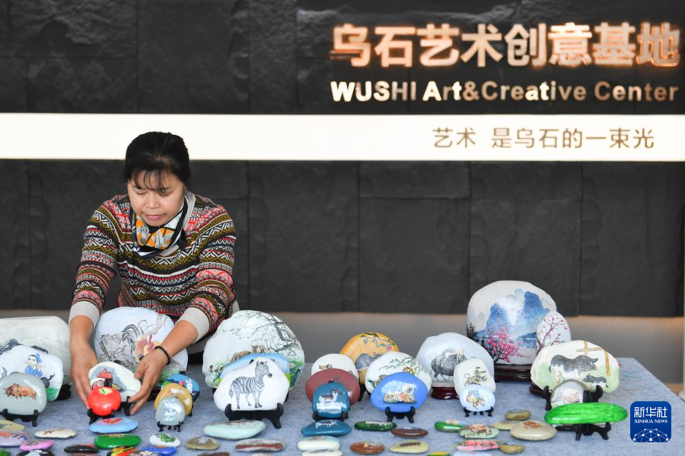 11月8日,在湖南省浏阳市小河乡乌石村,农民在画室绘制石头画。