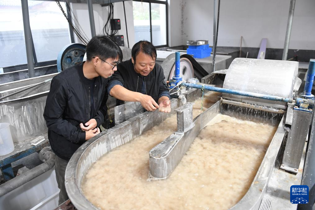 11月9日,在开化纸传统技艺工坊,黄宏健(右)和儿子黄鑫康在查看纸浆的匀度。