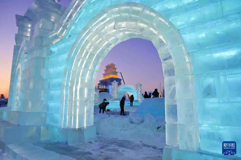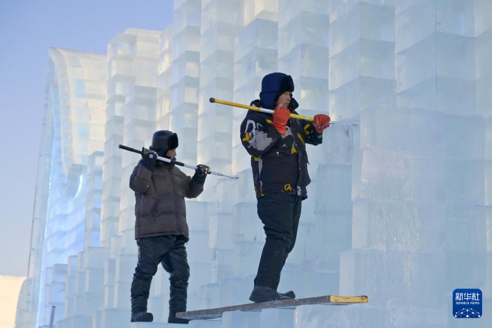12月14日,工人在哈尔滨冰雪大世界园区建设现场施工。
