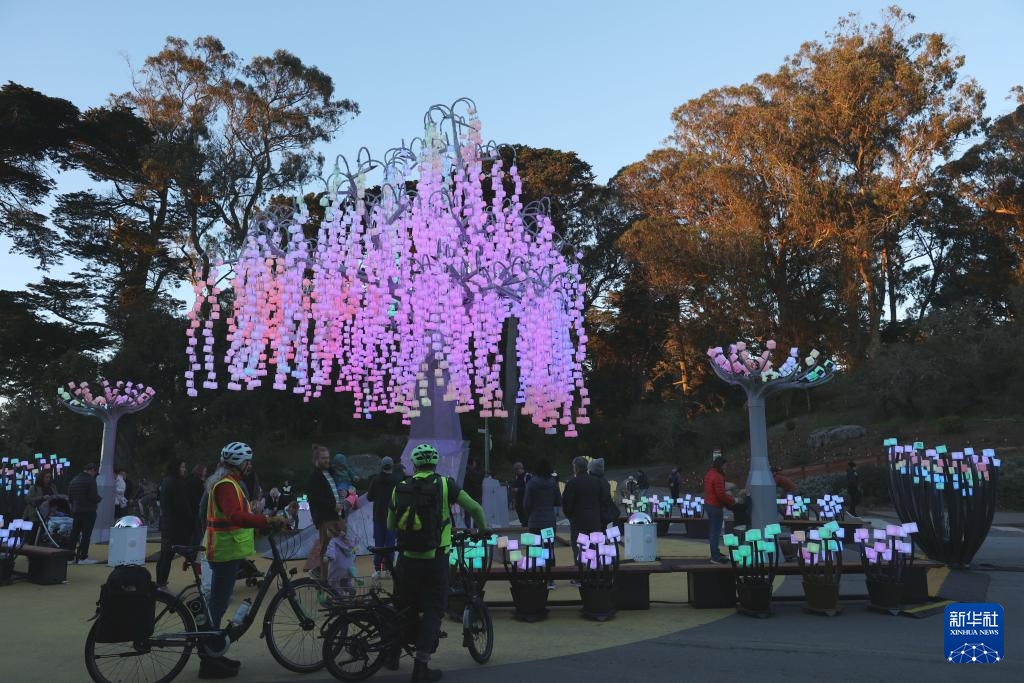 12月23日,人们在美国旧金山的金门公园观赏灯饰。