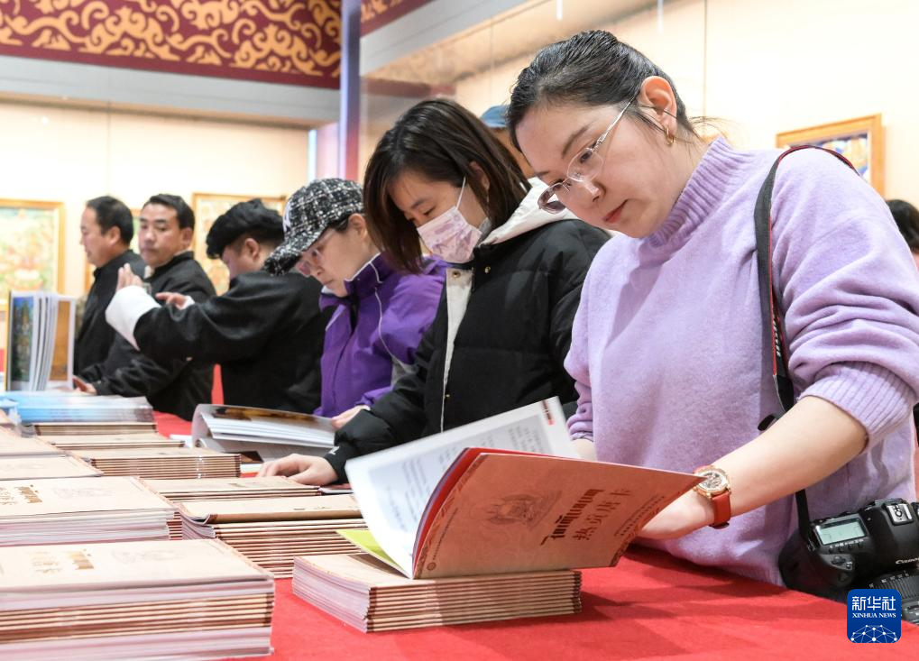 12月27日,观众在展览现场观看介绍热贡艺术的书籍资料。