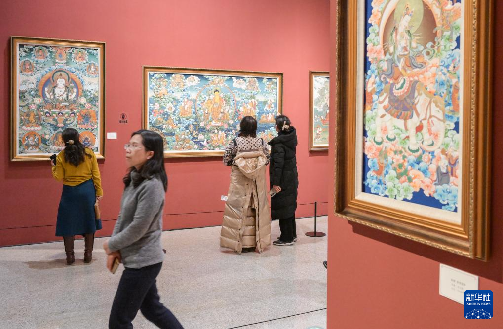 12月27日,一位画师(前左)在展览现场向观众介绍热贡唐卡的绘制工艺。