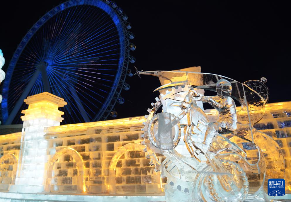 1月4日在哈尔滨冰雪大世界园区拍摄的蒙古选手参赛冰雕作品《梦想》。