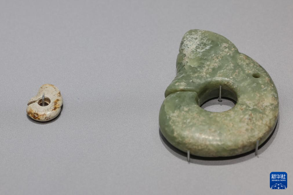 6月8日在“文明之光——红山·良渚与中华文明”主题展览上拍摄的红山文化勾云形玉器。