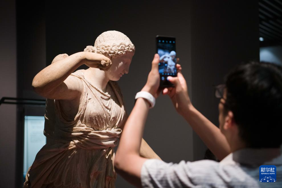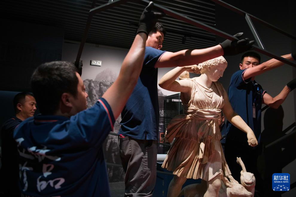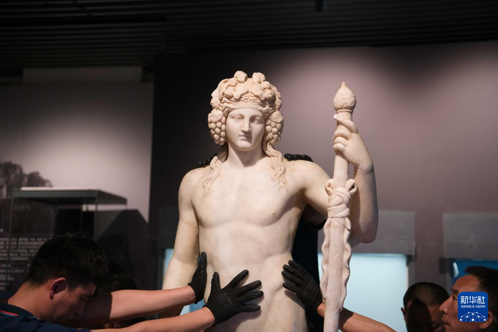 7月2日,工作人员将开箱后的古希腊文物放置在展台上。