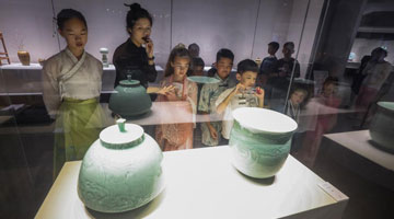 这是新疆库车市龟兹魏晋古墓遗址博物馆展出的陶器(7月15日摄)。