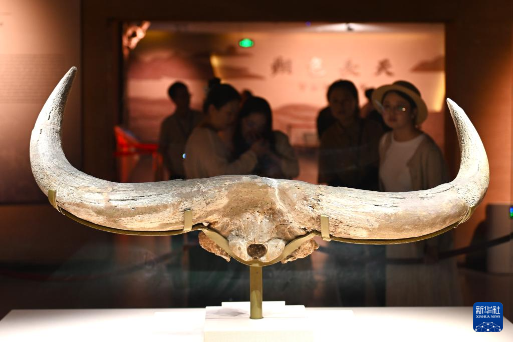 9月1日,游客在宁夏博物馆观赏牛头化石。