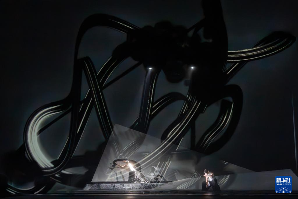 香港舞蹈团《快雪时晴》在舞台设计上加入水墨元素,舞者与之互动会留下书法般的痕迹(10月11日摄)。新华社发(香港舞蹈团供图)