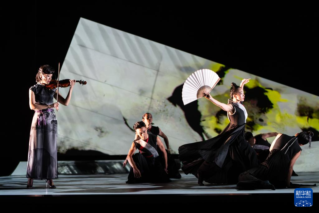10月11日,香港舞蹈团《快雪时晴》在香港西九文化区戏曲中心上演,糅合舞蹈、书法、武术、弦乐及新媒体的跨界元素。新华社发(香港舞蹈团供图)