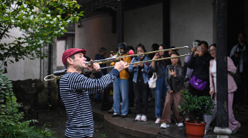 11月14日,在上海博物馆东馆中国历代绘画馆,观众在明代文徵明的《真赏斋图》前驻足观看。