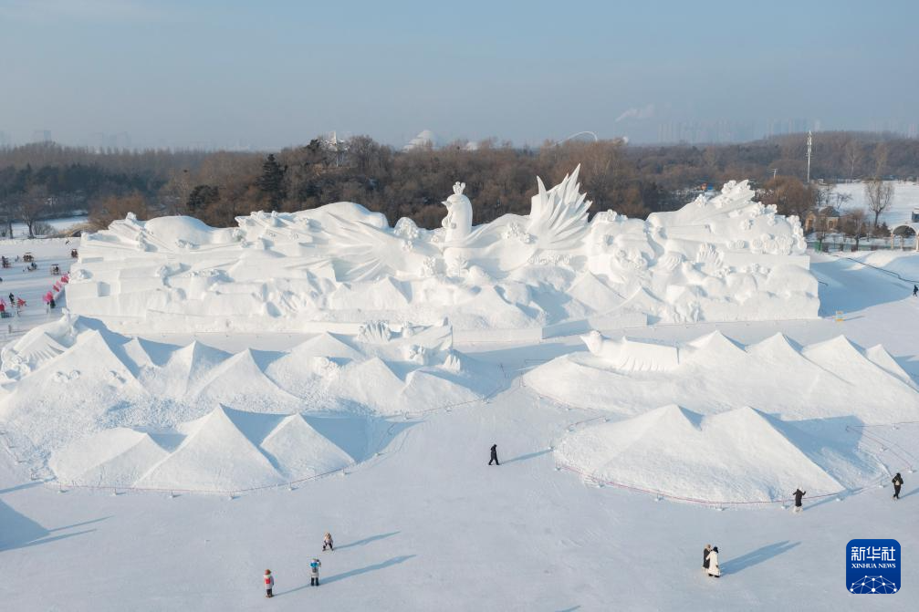 1月6日,在哈尔滨太阳岛雪博会园区,游客观赏本届雪博会主塑《雪艳春》(无人机照片)。《雪艳春》以“百鸟朝凤”为灵感源泉,鸟与梅花元素相互交织,长100米,高30米。