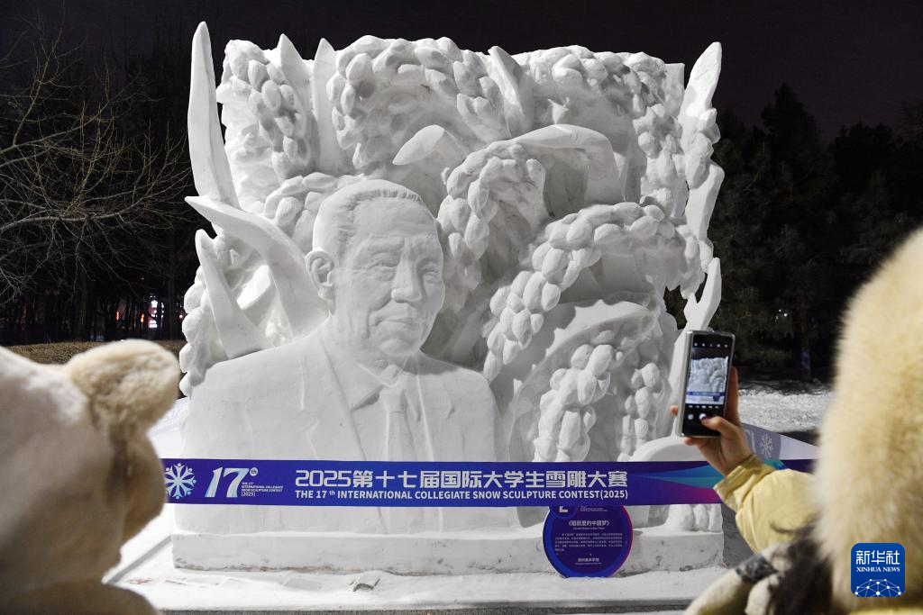 1月7日,人们在哈尔滨工程大学校园内拍摄雪雕作品《稻田里的中国梦》。该作品获2025第十七届国际大学生雪雕大赛特等奖。