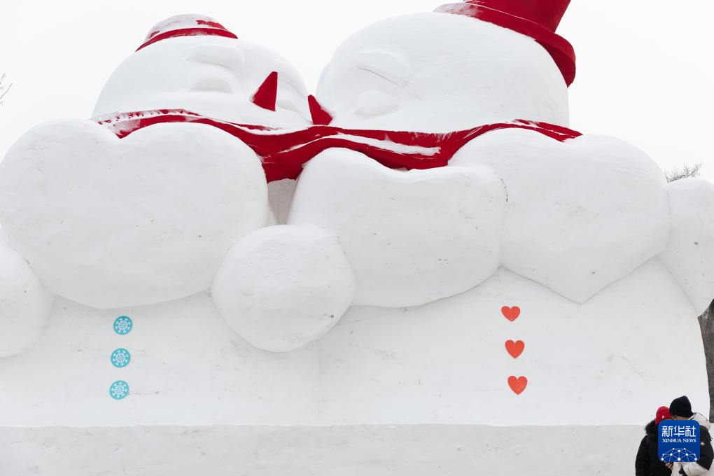 1月13日,在太阳岛雪博会园区,游客经过雪雕《亲亲雪人》。