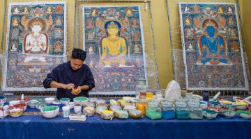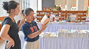 8月18日,游客在三福古典家具有限公司文创产品展示台试戴木制手串。