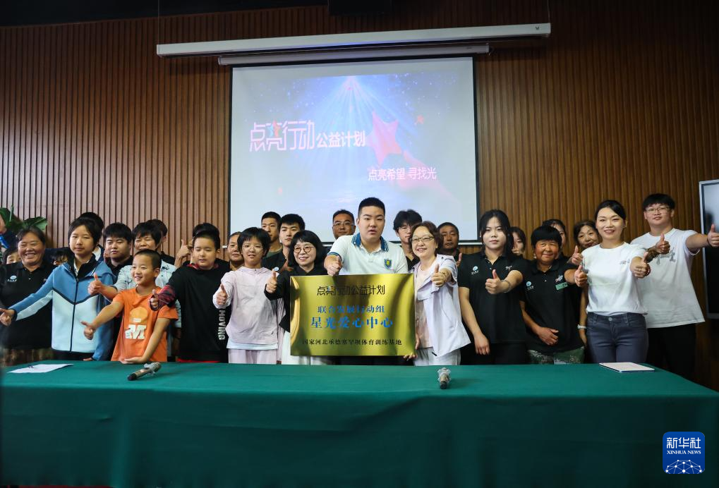 8月18日,王剑书(前排右五)参加“点亮行动公益计划”与国家河北承德体育训练基地的合作仪式。
