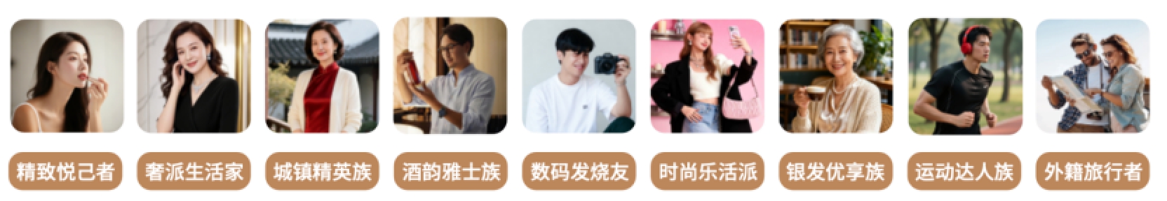 伴随中国旅游零售市场向高质量发展转型,消费客群的结构性变化成为行业转型的核心信号,“广覆盖”的传统逻辑逐渐被“精准化”的圈层运营取代。中免集团基于消费贡献、品类偏好、年龄分层、地域分布等核心维度,将核心客群拆解为九大细分类别,每个圈层都带着清晰的需求标签,精准覆盖不同场景下的消费诉求,勾勒出旅游消费的多元图景:31-45岁一二线“精致悦己者”主打高端护肤;高净值“奢派生活家”偏爱腕表珠宝;三四线“城镇精英”务实追品质;31-50岁男性“酒韵雅士”热衷高端酒饮;21-35 岁“数码发烧友”聚焦科技产品;16-30岁Z世代“时尚乐活派”追彩妆潮流;60+“银发优享族”重健康消费;26-45 岁“运动达人”选专业装备;外籍旅行者青睐中国特色商品。