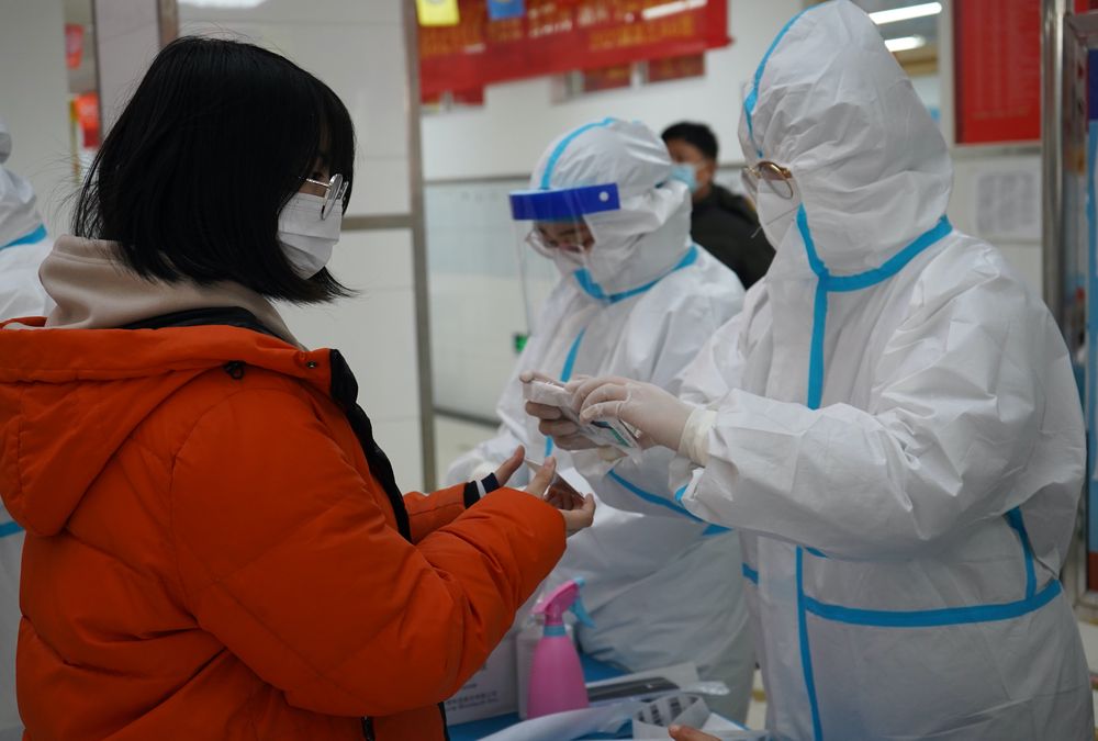 ↑1月11日,醫務人員在石家莊精英中學為接受核酸采樣的高三學生錄入信息。