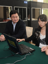 新華網工作人員在直播現場前做調試準備工作