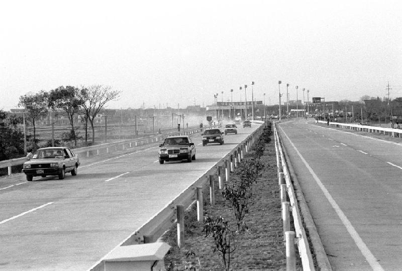 我國第一條新筑的全立交、全封閉、現代化設施齊全的滬嘉高速公路1988年10月31日下午正式通車。公路全長20.5公里(含兩端入城段道路),路寬45米,為4車道。晝夜通車可達4萬輛。新華社記者張劉仁攝(1988年11月15日發)