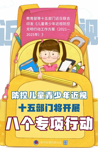 編輯: 馬璐璐 設(shè)計: 馬璐璐 2021年05月14日 12:16:56 來源: 新華網(wǎng)????? 教育部等十五部門近日聯(lián)合印發(fā)《兒童青少年近視防控光明行動工作方案(2021—2025年)》,共同實施八個專項行動防控兒童青少年近視。工作方案提出,力爭到2025年每年持續(xù)降低兒童青少年近視率,有效提升兒童青少年視力健康水平。