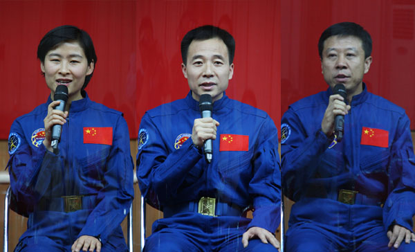 執行天宮一號與神舟九號載人交會對接任務航天員乘組與記者見面