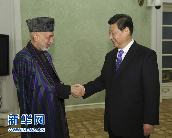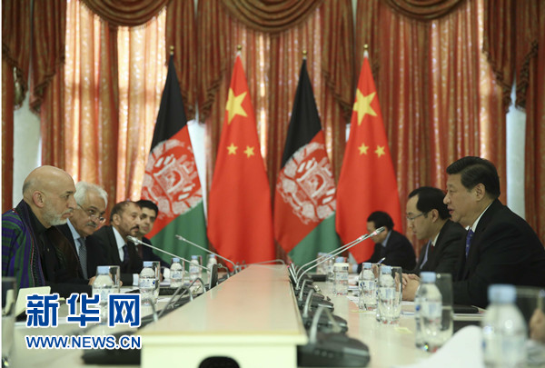 ????習(xí)近平指出,2014年之后,阿富汗的命運(yùn)將更加緊密地同地區(qū)國(guó)家聯(lián)系在一起。中方支持阿富汗融入地區(qū)經(jīng)濟(jì)合作。中方將于8月舉辦阿富汗問(wèn)題伊斯坦布爾進(jìn)程第四次外長(zhǎng)會(huì),我們?cè)竿⒎矫芮泻献鳎k好這次會(huì)議。中方也愿推動(dòng)上海合作組織在阿富汗問(wèn)題上發(fā)揮更大作用。