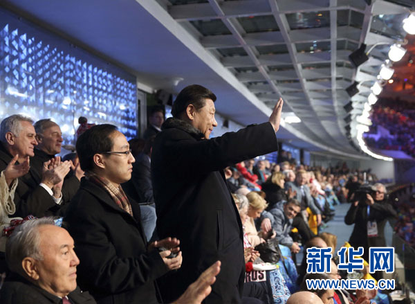 當?shù)貢r間2月7日晚8時14分,北京時間8日零時14分,第二十二屆冬季奧林匹克運動會在俄羅斯索契隆重開幕。國家主席習近平應俄羅斯總統(tǒng)普京邀請出席開幕式。這是習近平向步入會場的中國代表團奧運健兒揮手致意。新華社記者 蘭紅光 攝