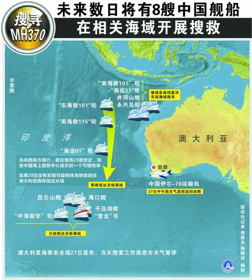 目前,馬航失聯客機搜救工作已進入第三階段。按照“明確方向、增加力量、連續作戰、整體推進”的部署,中國海上搜救中心進一步優化了后續搜尋方案。我方現在有12艘艦船、8架艦載直升機、3架固定翼飛機已經到達或者正在趕往南印度洋海域開展搜尋,我國已成為水面搜救主力,當前的主要任務是搜尋與失聯飛機有關的所有可疑物體。