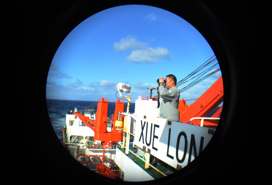 ????經中國海上搜救中心同意,“雪龍”號科考船28日下午全速趕往澳大利亞海事安全局最新調整的搜尋區,并將與“海巡01”會合,進行中方船只現場指揮聯絡工作的交接。根據國際調查團隊向澳方提出的建議,澳大利亞海事安全局28日調整了搜索部署,搜尋范圍發生較大改變。新華社記者張建松攝