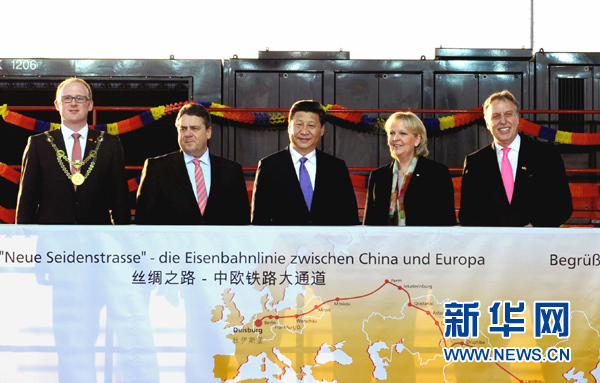 ????習(xí)近平來(lái)到火車站臺(tái)。三聲鑼響后,一列從中國(guó)重慶始發(fā)的列車滿載著貨物緩緩駛?cè)搿_@里是由重慶經(jīng)新疆跨歐亞直至歐洲的渝新歐國(guó)際鐵路聯(lián)運(yùn)大通道的終點(diǎn)。