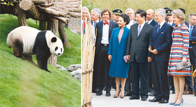 兩國元首夫婦為大熊貓園揭幕。許多當地民眾特別是少年兒童迫不及待地等候在那里。習近平和彭麗媛給孩子們送上大熊貓毛絨玩具。當地兒童將自己繪成的大熊貓圖畫贈給彭麗媛和瑪蒂爾德王后。