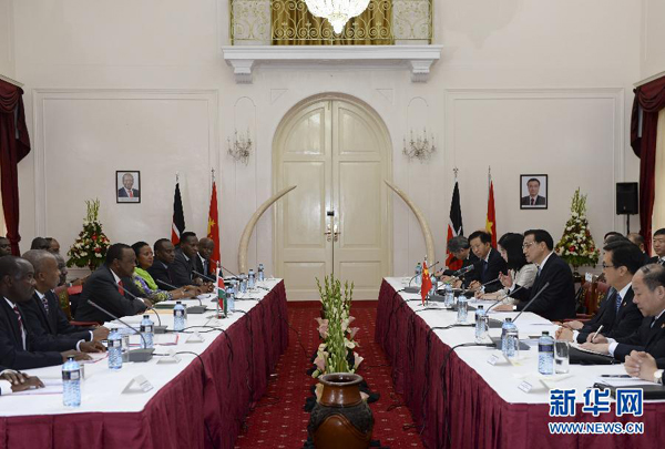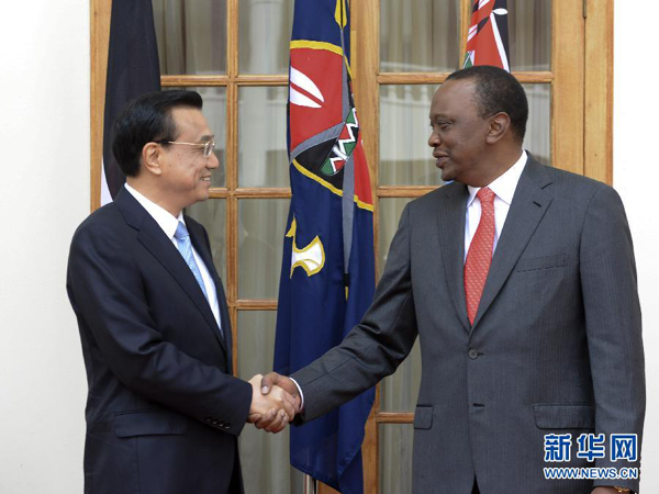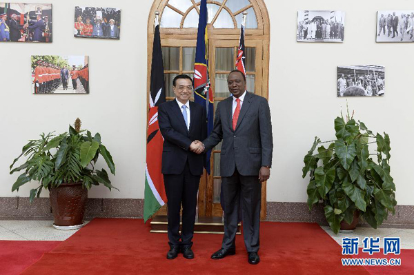 ????肯雅塔代表肯尼亞政府和人民熱烈歡迎李克強(qiáng)訪肯,表示在周恩來(lái)總理訪非50周年之際,李克強(qiáng)總理對(duì)非洲進(jìn)行的里程碑式訪問(wèn)取得圓滿成功,將進(jìn)一步深化非中新型戰(zhàn)略伙伴關(guān)系。肯中有著相同的歷史遭遇和發(fā)展任務(wù),肯方感謝中方對(duì)肯經(jīng)濟(jì)社會(huì)發(fā)展和保護(hù)生態(tài)環(huán)境、野生動(dòng)物資源的幫助和支持,高度贊賞中國(guó)為維護(hù)非洲和平與發(fā)展作出的重要貢獻(xiàn),完全贊同李克強(qiáng)總理在非盟演講中提出的“461”非中合作框架和在世界經(jīng)濟(jì)論壇非洲峰會(huì)特別致辭中提出的合作建設(shè)非洲基礎(chǔ)設(shè)施“三大網(wǎng)絡(luò)”的主張,愿與中方加強(qiáng)戰(zhàn)略溝通,全面推進(jìn)各領(lǐng)域合作,實(shí)現(xiàn)共同發(fā)展。肯方愿做中國(guó)企業(yè)進(jìn)入非洲的門(mén)戶,為推動(dòng)非中合作發(fā)揮積極作用。