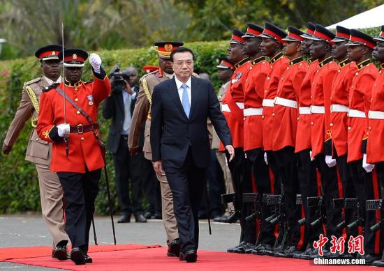 5月10日,中國國務院總理李克強在肯尼亞總統府廣場出席肯總統肯雅塔舉行的歡迎儀式。中新社發 劉震 攝
