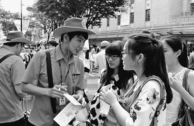 圖為中文旅游咨詢員李潤(rùn)雨(左二)正在熱心地為中國(guó)游客指路。本報(bào)記者 萬宇攝