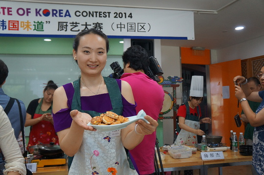 ????6月28日,駐華韓國文化院,2014“韓國味道”廚藝大賽現場。圖為獲勝選手沈振華和她的獲獎菜品。新華網 王俊景 攝
