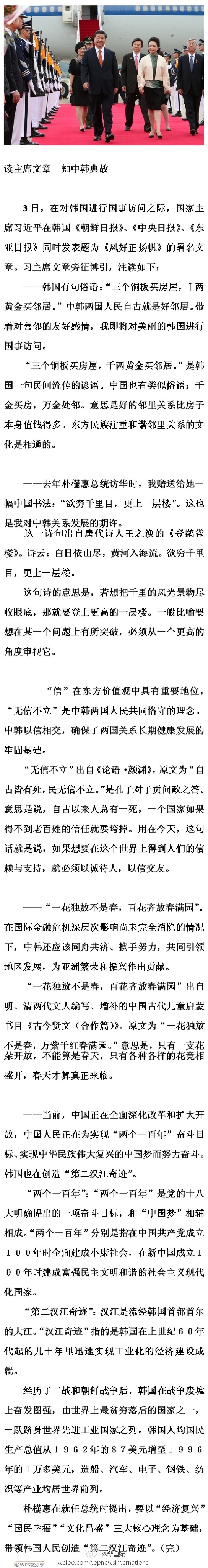 ????新華網北京7月4日電 據新華社“新國際”微博報道,3日,在對韓國進行國事訪問之際,國家主席習近平在韓國《朝鮮日報》、《中央日報》、《東亞日報》同時發表題為《風好正揚帆》的署名文章。習主席文章旁征博引,注讀詳見長微博。