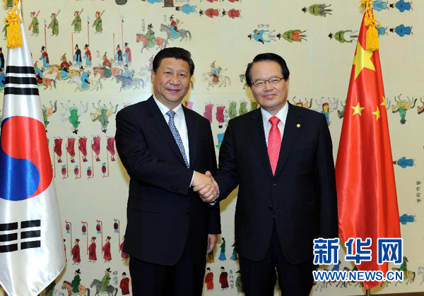 ????7月4日,國家主席習近平在首爾會見韓國國會議長鄭義和以及韓國各政黨領袖和友好議員代表。 新華社記者 饒愛民 攝