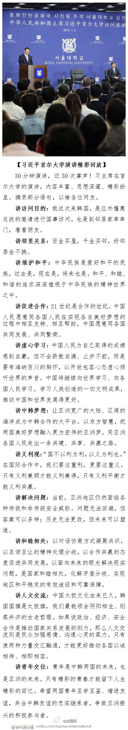 ???? 新華網北京7月4日電 據新華社“新國際”微博報道,30分鐘演講,近30次掌聲!習主席在首爾大學的演講,內容豐富、思想深邃、精彩紛呈。摘錄部分語句,以饗各位網友。