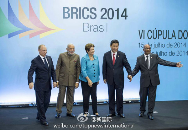 ???? 新華網(wǎng)北京7月16日電 據(jù)新華社“新國際”微博報(bào)道,習(xí)近平在出席金磚國家領(lǐng)導(dǎo)人第六次會(huì)晤時(shí)提出,要發(fā)揚(yáng)金磚國家獨(dú)特的“開放、包容、合作、共贏”的合作伙伴精神,要堅(jiān)定不移推動(dòng)經(jīng)濟(jì)可持續(xù)增長,堅(jiān)定不移形成全方位經(jīng)濟(jì)合作,堅(jiān)定不移塑造有利外部發(fā)展環(huán)境,堅(jiān)定不移提高道義感召力。