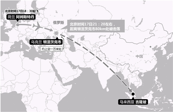 俄羅斯國際文傳電訊社報道說,這家波音客機原定由荷蘭阿姆斯特丹飛往馬來西亞首都吉隆坡。在還有50公里就將進入俄羅斯領空時“開始墜落,而后被發現在烏克蘭境內的地面燃燒”。