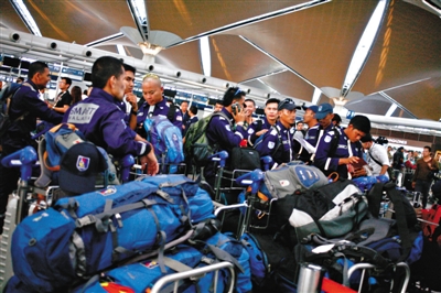 當地時間7月18日,馬來西亞國際機場,馬來西亞派特殊救災和救援小組成員前往MH17墜機事故現場。圖/CFP