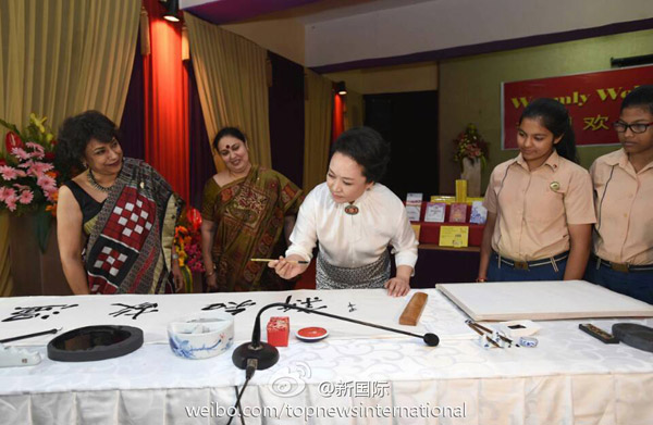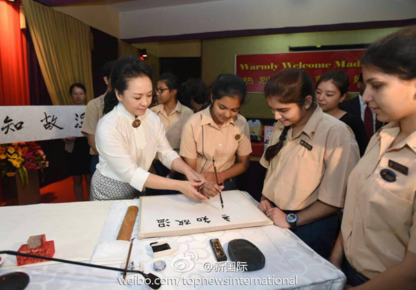 ????新華網北京9月18日電 據新華社“新國際”微博報道,習近平主席夫人彭麗媛18日上午在新德里參觀泰戈爾國際學校時,用毛筆書寫成語“溫故知新”,并簽名蓋上印章。她對師生們逐字講解后說,我們要經常溫習學過的知識,不斷學習掌握新知識,開拓創(chuàng)新,與時俱進。希望同學們認真學習,更好報效祖國,祝你們成功。
