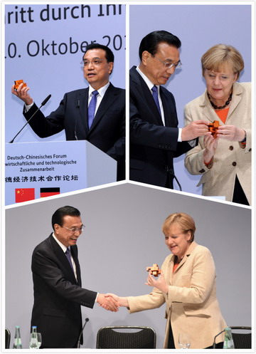 ????李總理說,這是訪前天津中德職業(yè)技術學院師生共同創(chuàng)作的作品,希望我送給默克爾總理。解開魯班鎖是解決一道難題,相信中德之間的合作能不斷創(chuàng)新,共同破解世界性難題,開啟美好的未來。