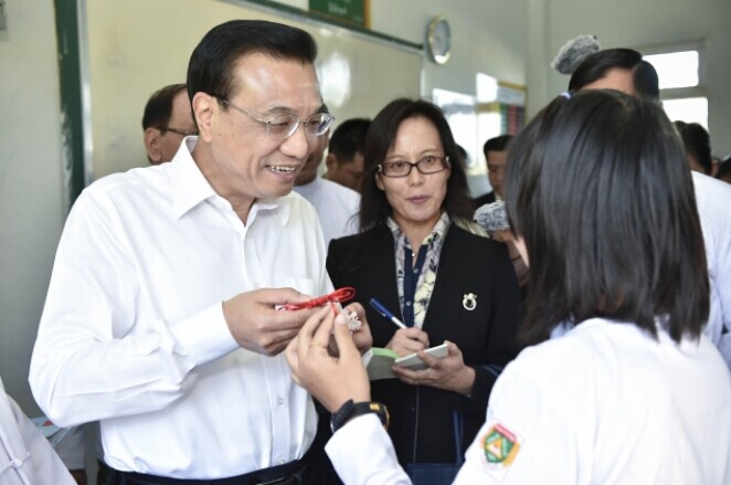 11月14日,克強總理來到內比都第十四中學與青少年們交流。