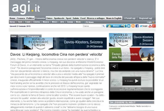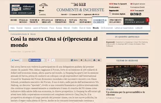 意大利24小時(shí)太陽報(bào)1月22日發(fā)表題為《中國重新向世界自我介紹》的評(píng)論性文章,介紹了李克強(qiáng)在世界經(jīng)濟(jì)論壇上的講話。文章稱,雖然國際社會(huì)一直在用西方國家的種族主義中心心態(tài)以及舊的眼光看待中國,中國國務(wù)院總理李克強(qiáng)的長期戰(zhàn)略眼光和他的新政策還是給達(dá)沃斯的聽眾們留下深刻印象。