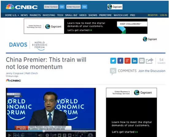 華爾街日?qǐng)?bào)、彭博新聞社、金融時(shí)報(bào)、CNBC和美聯(lián)通訊社等美國主流媒體,都報(bào)道了李克強(qiáng)總理在達(dá)沃斯論壇上有關(guān)中國將避免經(jīng)濟(jì)硬著陸,以及確保在中長期經(jīng)濟(jì)有所增長的講話。