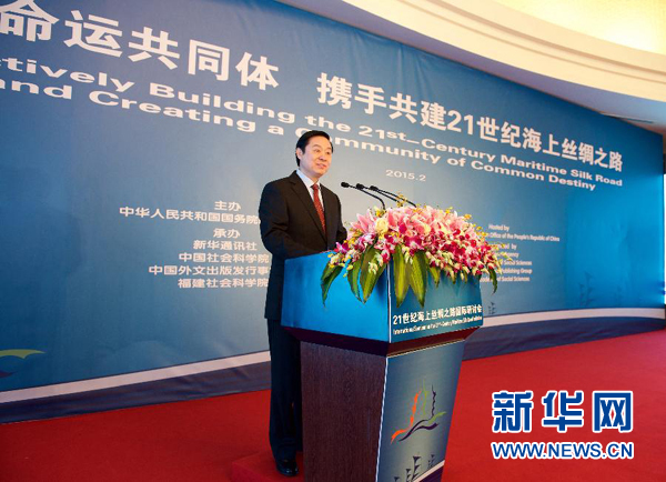 2月12日,中共中央政治局委員、中央書記處書記、中宣部部長劉奇葆出席在福建泉州召開的21世紀(jì)海上絲綢之路國際研討會,發(fā)表《揚帆海上絲路 實現(xiàn)共贏發(fā)展》的主旨演講。新華社記者 姜克紅 攝