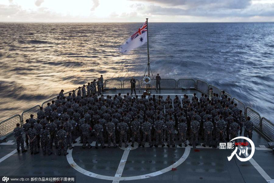 從南中國海、馬六甲海峽,再到南印度洋。馬航MH370的搜救工作可謂是一波三折。2014年4月26日,參加馬航失聯航班搜尋的澳大利亞海軍士兵參加澳紐軍團日黎明升旗儀式。
